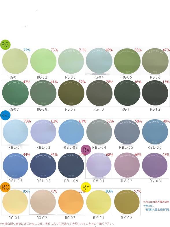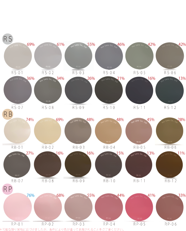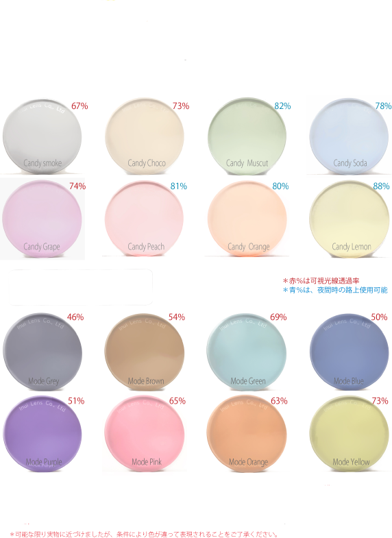 度なしカラー、クリアレンズに関してご注文時に下記CR39レンズ、画像もしくは以下カラー見本からお選び頂き、備考欄にご希望の色番号をご記入ください。